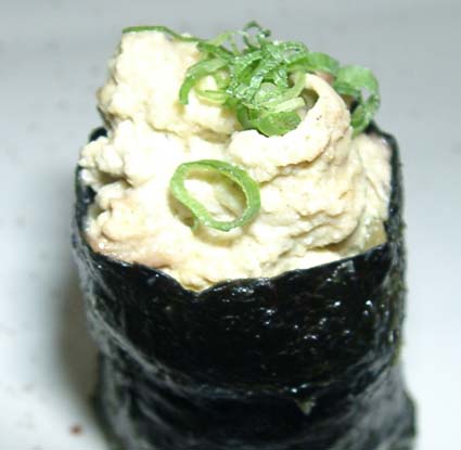 105 柞蚕寿司 未分類 X Facebook はてブ LINE コピー 2006.11.22 サクサン(柞蚕)はヤママユガ科で中国産。クヌギやコナラなどドングリのなる木の葉を食べて育つ。吐く糸は高級織物となり、さなぎは食用となる。大久保駅近くの中国料理食材店で冷凍で売られている。皮は硬いので茹でてむき、中身を塩コショウしてネタとした。見た目と食感は豆腐だが、いくぶん青臭さのようなものがあり、例えると蒸し大豆とか、豆乳とかに近いと言えばいえようか。