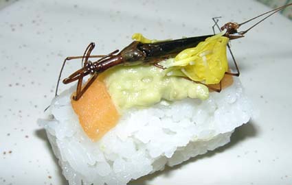 108 水蟷螂寿司 昆虫料理 X Facebook はてブ LINE コピー 2006.11.27 ミズカマキリ(水蟷螂)はカメムシ目タイコウチ科の水棲昆虫。カメムシ目だがコオイムシ同様タガメのような芳香はない。カマキリととてもよく似ているが他人の空似である。自然界の造作の妙を味わうのも乙な食べ方であろうか。
