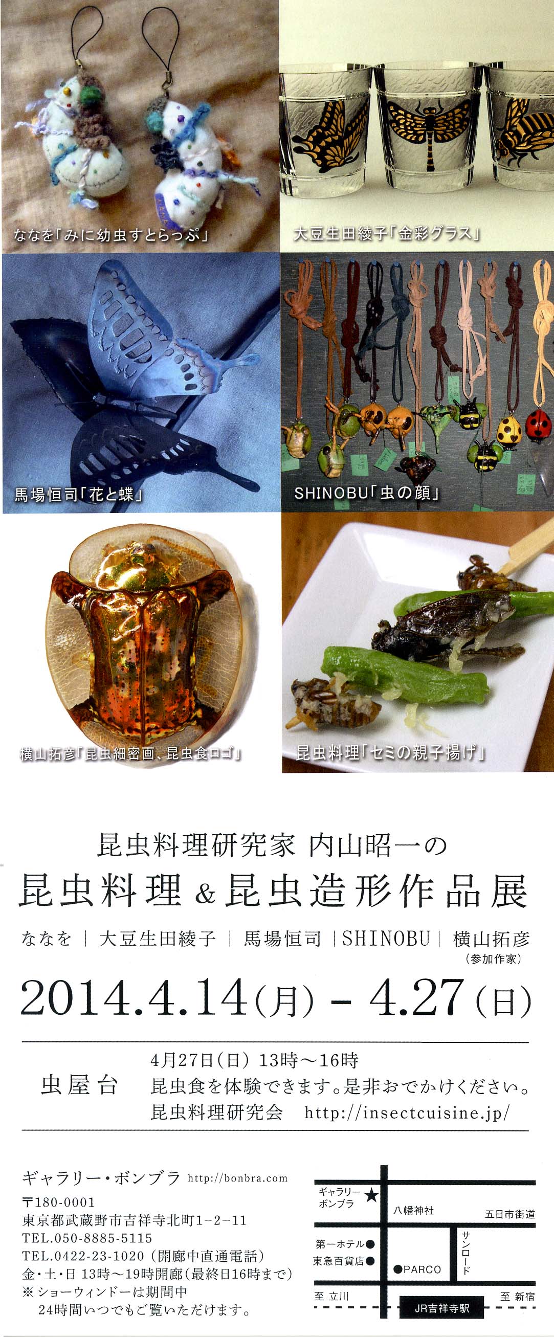 642 吉祥寺で虫屋台、27日13~16時 未分類 X Facebook はてブ LINE コピー 2014.04.25 吉祥寺のギャラリーボンブラで恒例の虫屋台を行います。 今年は虫綿あめが初登場。多数おでかけください。 ●タガメ風味のポップコーン【小カップ:100円】 ●セミ幼虫の綿あめ【1本:100円】 ●ミールワームのブラウニー【1個:100円】 ●蜂の子のクラッカー【1枚:100円】 ●地蜂せんべい【2枚セット:200円】 ※カイコ茶サービス