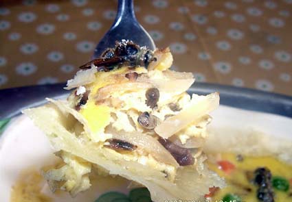 2 ベーコン、スズメバチ(幼虫・サナギ・成虫)を加え、さらに炒め、塩・コショウで味を調える。炒めたらハチの成虫は別に取り置く。