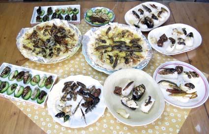 自宅で試食していて得体の知れない感覚に襲われた。ここは私たち家族が日常食事をしている場所なのだが、そのテーブルにさまざまな昆虫料理の皿がならんでいる。なんだか変である。日常的非日常空間なのだ。晴れた秋の昼下がり、テレビカメラが覗く非日常空間にわれわれがいて、虫をのせたピザを食べ、虫をのせた寿司を食べている。暖かな日差しがまぶしい。それは日常と非日常が交錯する異次元空間にいるという摩訶不思議な感覚だった。