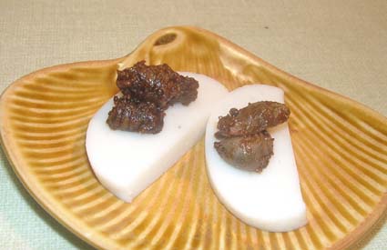 漬けること一週間、待ちかねて試食した。それぞれを蒲鉾に二、三個のせて味わった(写真の左がカイコサナギ、右がキイロスズメバチ幼虫)。いずれも味噌の旨味がじわりとしみこんだ逸品となった。とりわけ外皮がやわらかい蜂の子はよく漬かっている。冬場の楽しみがまた一つ増えたようだ。