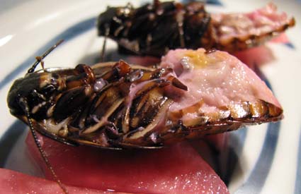マダガスカルゴキブリそのものは美味しいですよ。胸のとこまでハサミを入れて、足の付け根あたりまでしゃぶったほうがいいです。足の付け根が美味しいんだよと教えたら、切り落とした足から身を吸ってた人が何人かいたけれど、みんな旨味を感じると言ってました。バッタの足もすすると美味いんだよと、想像すると猟奇的な絵になることを教えておきました、おーほほほほ。