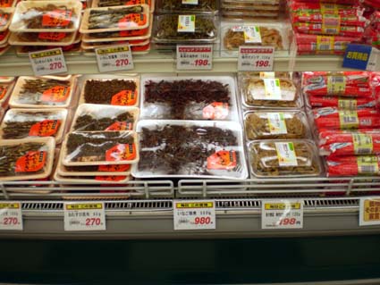 223 長野県中野市のスーパー 食文化 X Facebook はてブ LINE コピー 2008.01.31 長野県中野市に住む友人が写真を送ってきてくれた。僕が昆虫食に関心を持っているのを最近知ってなにかと情報を送ってくれるのだ。写真には陳列台に並んだイナゴとカイコサナギの佃煮が写っていた。近所のスーパーで前からずっと売られているのに気が付かなかったと彼は書いている。長野では馴染みの食材である。 いなご佃煮 500g 980円 さなぎ佃煮 120g 260円