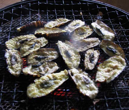 サクサンは柞蚕と書く。「柞」はクヌギやコナラなどの総称。柞を食べる蚕の意。ヤママユガ科の大型ガの一種で原産地は中国。いつも新宿百人町の中国食材店で購入する。500g/550円。シンプルな網焼きである。バターを塗ってコクを出している。これだと焼きたては外皮もパリパリ食べられる。ただちょっと焼きすぎると焦げやすいので焼き加減に注意する。そのまま食べてもほんのり甘くて美味しいが、好みでワサビマヨネーズ、タガメチリペーストなど塗っていただくとひと味ちがった味わいを楽しめる。