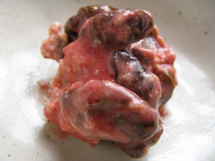 腐乳は豆腐に麹をつけ塩水中で発酵させた食品で、独特の臭みと塩辛さがある。臭豆腐の強烈な臭いに比べれば穏健な食べ物である。紅麹を使ったものを紅腐乳といい、今回はこれにカイコさなぎを漬けてみた。発酵した紅腐の旨味がカイコ臭を和らげ、ねっとりした豆腐のウニに似た食感と相まって、病みつきになりそうな仕上がりである。まだ漬け込んで10日ほどなので、ややカイコと豆腐との一体感にかける気がする。もう少し熟成したほうがさらに味わいぶかいものになる予感がする。先日の試食会でも独特の個性的味わいに惹かれた人も多かった。