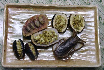 019 里芋衣かつぎ風 盛り合わせ 昆虫料理 X Facebook はてブ LINE コピー 2005.11.07 里芋の美味しい季節がやってきた。中ぐらいの里芋を皮付きでラップにくるみレンジにかけ、三枚にスライスし、アリ、クモ、タガメをそれぞれトッピング。残ったアリを茹でたサクサンにはさんでみた。これから冬に向けて多くなるホームパーティーなどにぴったり。虫料理で話が盛り上がること間違いない。美味しくヘルシーな昆虫料理は酒の肴によくあう一品。ぜひ作りたいという好奇心旺盛な人のために、個々のレシピを順次掲載していくことにしよう。
