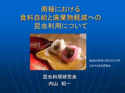 「数々の発表の中で一番興味をそそられたのが、昆虫料理でした。奇想天外さが気に入りました。探検とは、芽生えた知的好奇心を発露させ、未知なるもの、未知なる科学的真理を求める旅だと思っています。フリーズドライを作るのも“探検”です。昆虫料理もなかなかの探検ですね。試食させていただいた昆虫料理、旨かったです!ワインが合いますね。7月1日からは極地研隊員室で仕事をしています。いつでも遊びにおいでください。」というメールを後日いただいた。極地におけるフリーズドライ食品の利用について発表された方からである。