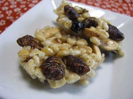 浅草名物に「雷おこし」がある。おこしの手作り教室が浅草で開かれていて、参加した方から「雷おこし手作りセット」なるものをいただく。そこで干したカイコさなぎを混ぜ込んでみることにした。以下のレシピはセットに同封のレシピを元に使いやすく改変している。