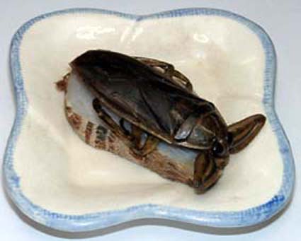 022 タガメのせ 里芋衣かつぎ 昆虫料理 X Facebook はてブ LINE コピー 2005.11.11 材料 里芋 1個 タガメ 1頭 作り方 (1)里芋を皮付きでレンジに2分かける。 (2)タガメをさっと茹で、腹部に調理ばさみで切り込みをいれる。 (3)里芋を3枚に切り、1枚にタガメをのせ、上から軽く押して香り付けする。 賞味ポイント タガメは既に塩ゆでして売られているので、里芋の味付けはいらない。タガメ特有のフルーティーな香りを楽しみたい。