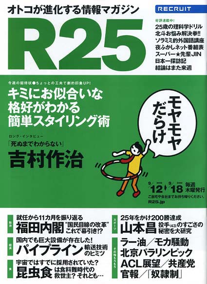 11日発行のフリーペーパー『R25』(リクルート発行、配布エリアは主に首都圏)の18頁に昆虫食の取材記事が載った。0円なので興味ある方はお読みください。ごらんのように表紙の左下方に「昆虫食」と大きく見出しが印刷されている。記事は「食糧難時代の救世主? 宇宙食でも注目される! 昆虫食のポテンシャル」といったテーマで書かれ、お土産に差し上げた「カイコおこし」が写っている。60万部というからかなりおおぜいの人が読んでくれるのではないか。