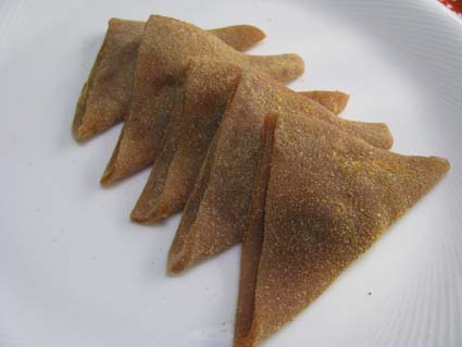 5 8cmほどの正方形に切り、中央に粒あんをのせ、カイコさなぎを押し込み、三角形に折り返す。