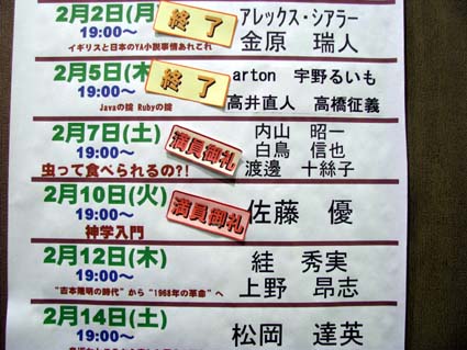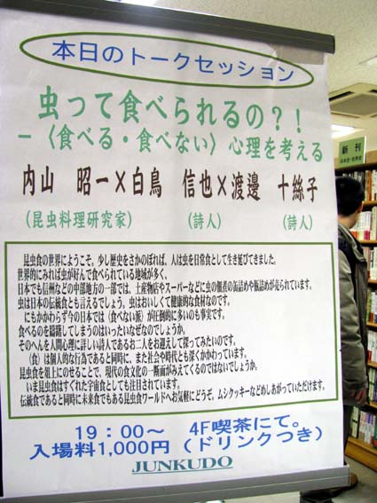 326 バグ・スイーツ・カフェ盛会 スイーツ X Facebook はてブ LINE コピー 2009.02.08 7日19時からジュンク堂池袋店で昆虫料理トークイベントを行う。予約者50人をこえ「満員御礼」となる盛会だった。昆虫食に対する関心の高まりを強く感じる。参加者層も若者中心の阿佐ヶ谷と違い、年配の方々も多く幅広かった。プロジェクタで料理写真を見ていただきながら、昆虫食の楽しさとおいしさ、重要性など話した。参加された皆さんにスイーツ3品を食べていただく。トークにご協力いただいた詩人の白鳥さん、渡邊さんに感謝。