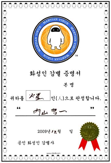 13日に韓国テレビ取材チームが大型バスに乗って我が家にやってきた。総勢15人はいたろうか。韓国有名コメディアン3人が揃ってやってきた。バラエティMCのイ・ギョンギュ、キム・クラ、キム・ソンジュの三人である。こちらも虫食い仲間に10人ほど集まってもらった。うち女性7人で女子高生2人を含む。明けて1月の放送ということで、「虫おせち」「虫雑煮」など作る。「火星人ウイルス」 という番組で、「特異で変わった一般人たちを招待して話をするリアルトーク番組で、タイトルの「火星人」は、周囲ではなかなか会えない極少数の特別な人たちを見ると、「どの星から来たんだ?」と聞くところに目をつけた」というのが製作意図のようだ。最後にイ・ギョンギュさんからなんだか怪しい「火星人ウイルス証書」らしきモノをいただく。
