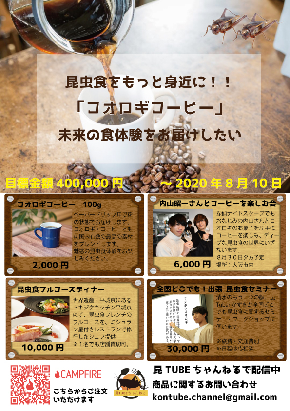 昆Tuberかずきが「コオロギコーヒー」を開発するためのクラウドファンディングに挑戦します!!