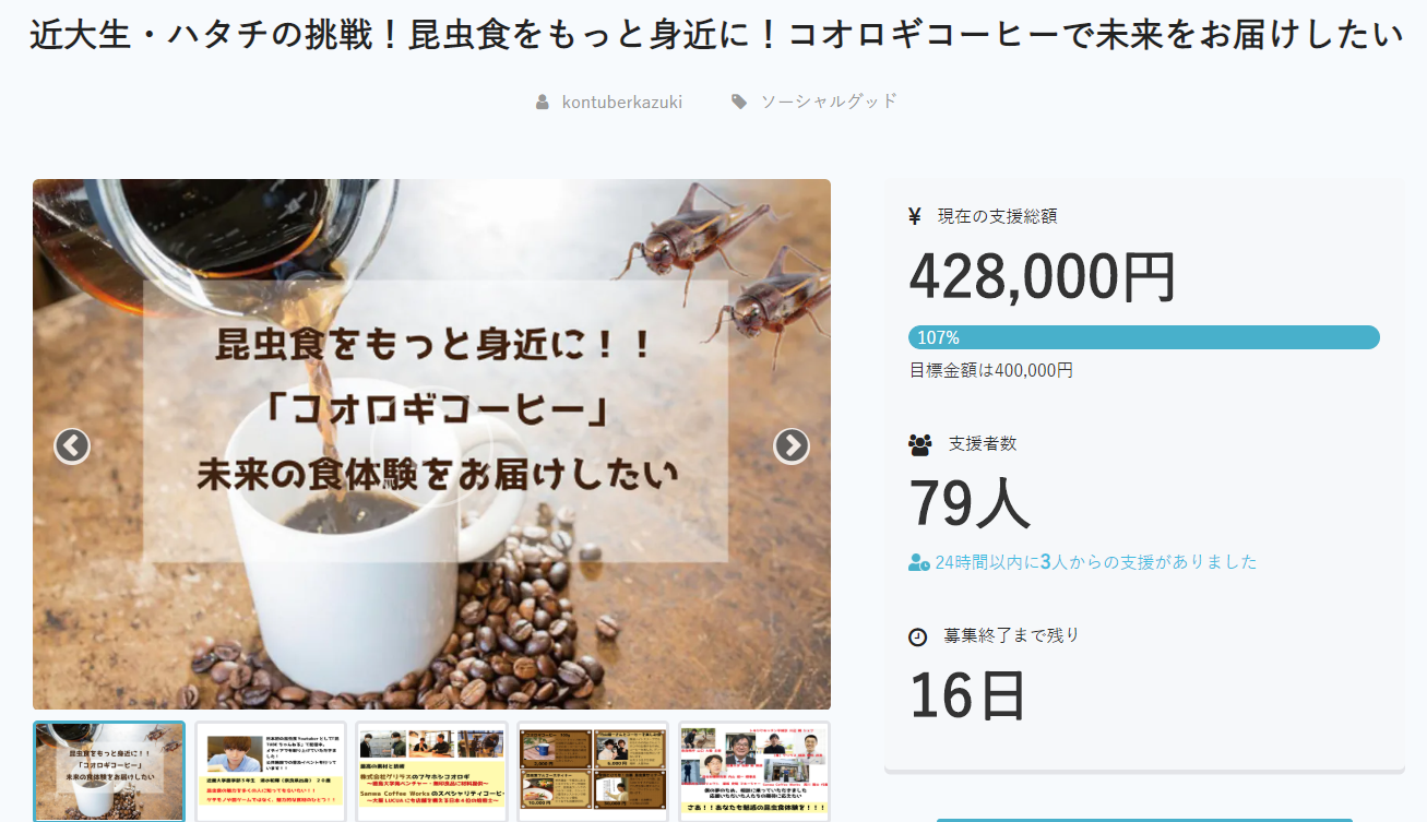 内山昭一さんにも応援いただいていましたコオロギコーヒーのクラウドファンディングですが、22日の夕方に、ついに、、、目標金額を達成することができました!!!