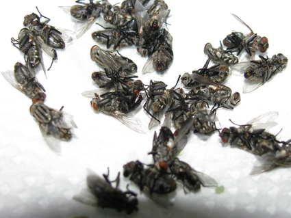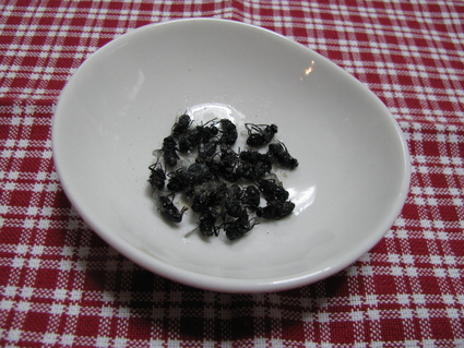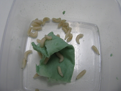 438 センチニクバエ 昆虫食 X Facebook はてブ LINE コピー 2010.09.14 センチニクバエを初めて食べる。某研究者からいただいた実験用だ。豚のレバーに産卵させ、3齢幼虫ぐらいから小麦胚芽、イースト、全粉乳の人工飼料で終齢まで飼育したという。幼虫と蛹はそのまま口に入れて噛む。人工飼育のせいか臭みはないが、それほど際だった旨みもない。蛹は暑かったためあっという間に羽化して成虫になった。これらは全部軽く素揚げして食べる。サクッとした食感。小さいので味もなにも分からないうちに終わってしまった。