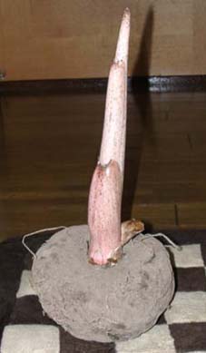 普通シリーズ第三弾はこんにゃくの登場。ここ数年群馬のこんにゃく芋をいただく。作ってみると時間はかかるがなんとか出来る。しかも刺身こんにゃくがこんなにもうまいものだったかと驚くほどだ。今年も大きな芋をいただいたのだが、そのうちと思っていて気づいたら写真のように芽が伸びてしまった。あわてて先日作ったので、以下作り方を簡単に紹介したい。