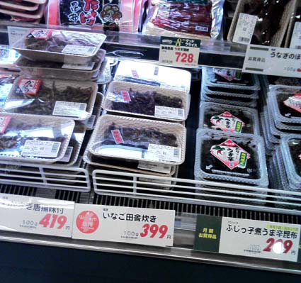 *田舎の家の近くにあるスーパーの売場である。メーカーの違ういなごが二種類売られている。