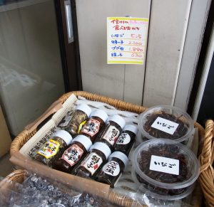 毎年立ち寄るお店。なんと店頭にイナゴ、ハチノコ、カイコサナギ、ザザムシのおなじみ4点セットが並んでいるではないか! 店頭に置いてあるのは初めて見る。お店で聞くと、「昆虫は売れ筋」とのこと。昆虫食ファンにとっては嬉しいコメントだ。若い人は面白がって買い、年配の人は懐かしがって買っていくという。