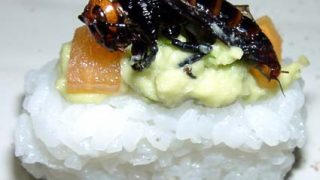ムカデ(百足)は狭義の意味では昆虫ではないが同じ節足動物の仲間である。付け焼きなどしてカリポリかじるのが食べ方の定番だが、今回の寿司シリーズにはカラッと揚げて寿司ネタで登場願った。食べ方としては、のっているムカデをいったんとりはずし、片手に...